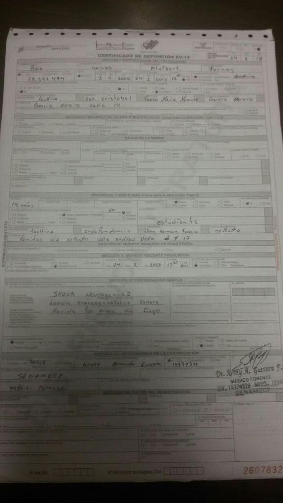 El diputado de la AN Homero Ruiz, compartió en su cuenta personal de Twitter, el acta de defunción del menor de edad asesinado el martes en la mañana en San Cristóbal a manos de un efectivo de la PNB.
